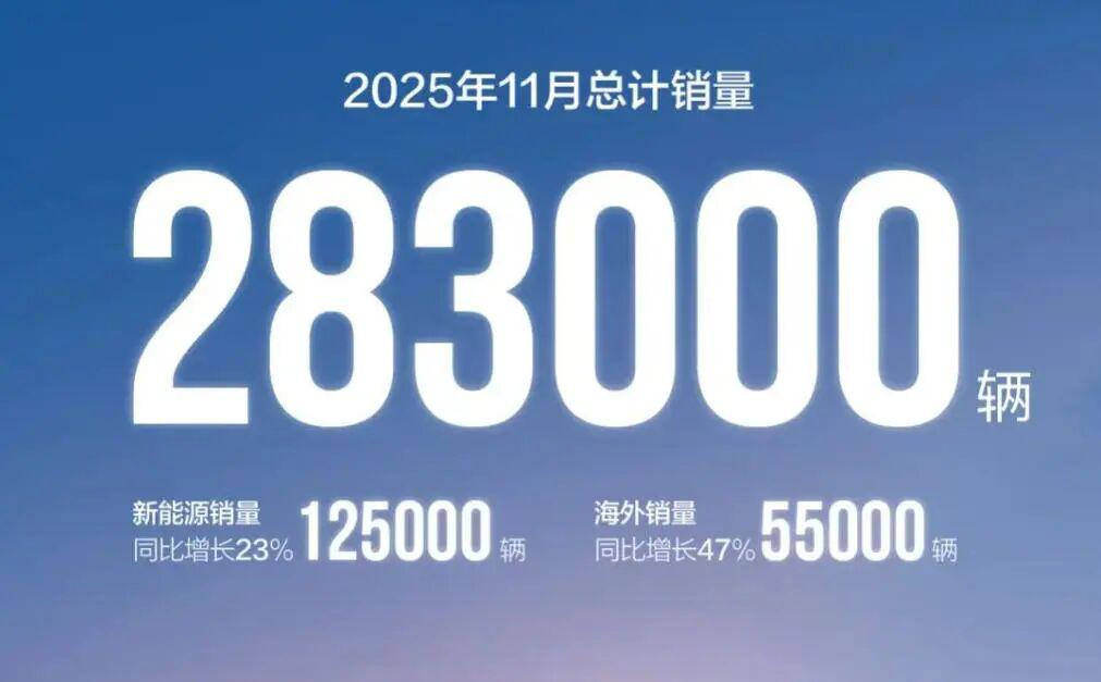 日前,长安汽车公布的 11 月销量快报显示,11 月新能源销量 12.5 万辆,同比增长 23%。新能源销量再次刷新记录,连续 3 个月破 100000 辆。海外销量 5.5 万辆,同比增长 47%,总销量 28.3 万辆,同比增长 2.3%。